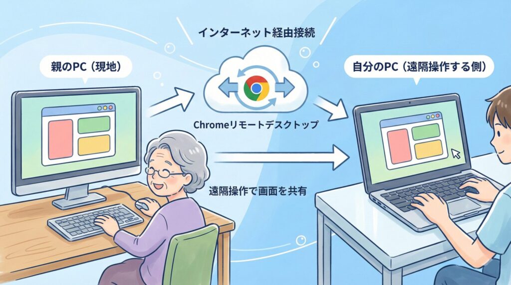 という役割分担で、自分のPCから、親のPCの画面をそのまま表示・操作できるイメージです。